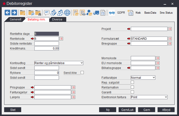 Debitorer kan opdeles i fem gruppe med hensyn til deres kontoudtog, - Almindelig, Påmindelse, Renter, Renter og påmindelse samt Aldrig. Påmindelse betyder, at en betalingspåmindelse udskrives på kontoudtoget i tilfælde af forfalden saldo. Renter betyder, at der kan beregnes renter til debitoren i tilfælde af en forfalden saldo. Sættes typen til Almindelig er ingen af der ikke kunne beregnes renter og påmindelsen vil ikke blive udskrevet. Endelig kan typen sættes til aldrig. Så kan det ikke lade sig gøre at udskrive kontoudtog til den pågældende debitor.
