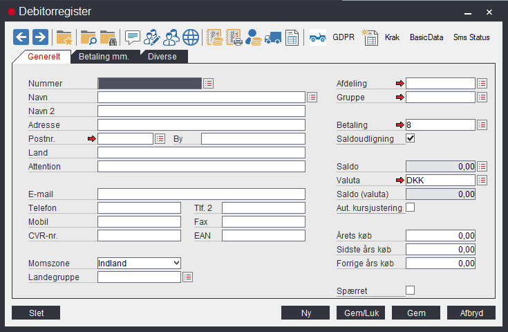 Debitorer oprettes, redigeres og slettes i debitorregisteret. Vinduet til debitorregisteret består af tre faneblade med felter. Nye debitorer oprettes ved at indtaste data og klikke på Gem. Eksisterende debitorer kan findes ved at indtaste debitornummeret eller ved at søge på debitoroversigten, der fremkommer ved klikke på et af ikonerne (