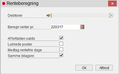 - Renter beregnes kun til debitorer, hvor feltet Kontoudtog er sat til Renter eller Renter og påmindelse.