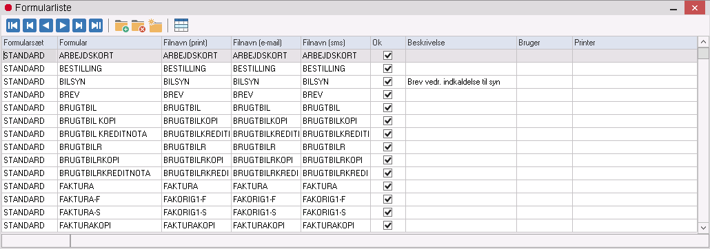 Formularlisten anvendes til at styre opsætningen af formularer (arbejdskort, fakturaer, kontoudtog og lignende) samt hvilke printere de forskellige formularer udskrives på. Formularlisten skal oprettes, før det er muligt at oprette og/eller tilrette en formular, hviletk gøres under punktet Rediger formular.