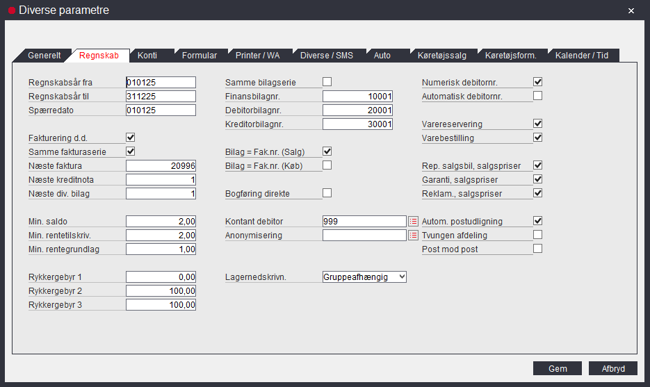 Felterne angiver første og sidste dato i regnskabsåret. Felterne må IKKE rettes manuelt ifm. en regnskabsafslutning. Felterne kan derfor kun rettes vha. en kode, der oplyses af Helios Auto ApS.