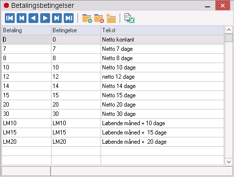 Betalingsbetingelser (Debitor / Tabeller eller Kreditor / Tabeller) kan knyttes til debitorer og kreditorer. Ud fra betalingsbetingelserne og fakturadatoen udregnes fakturaens forfaldsdato. Når en debitor/kreditor vælges på en salgs-/købsordre trækkes den tilhørende betalingsbetingelse med over på ordren. Den kan så ændres på de enkelte ordrer, hvis de ønskes.