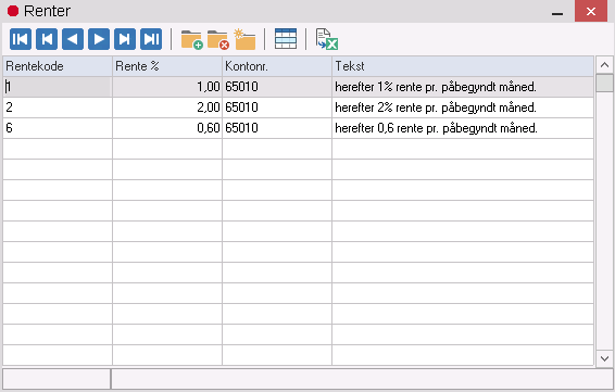 Rentekoder oprettes i tabellen, der findes under Debitor / Tabeller. Rentekoder knyttes til debitorer og anvendes så ved beregning af renter. Se afsnittet Beregn renter for mere om dette.
