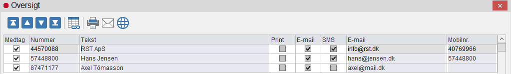 Når der klikkes Ok, gennemløbes debitorregisteret og debitorer, der opfylder kriterierne findes. Hvis en debitor opfylder kriterierne, medtages debitoren i oversigten, der vises efterfølgende. Dog kun hvis feltet Info - Generelt er markeret på debitoren og mindst én af de tre felter Info - sms, Info - e-mail og Info - print også er markeret på debitoren. Det tre sidstnævnte afgør desuden, hvilke kolonner (sms, e-mail, print) i udvalgsoversigten, der er markeret.