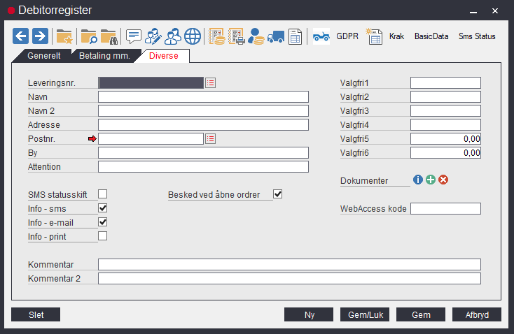 Debitorer oprettes, redigeres og slettes i debitorregisteret. Vinduet til debitorregisteret består af tre faneblade med felter. Nye debitorer oprettes ved at indtaste data og klikke på Gem. Eksisterende debitorer kan findes ved at indtaste debitornummeret eller ved at søge på debitoroversigten, der fremkommer ved klikke på et af ikonerne (