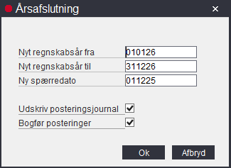 Hvis felterne Udskriv posteringsjournal og Bogfør posteringer var markeret, da årsafslutningen blev foretaget, skal du ikke foretage dig mere. Regnskabet for næste regnskabsår er nu klar til brug.