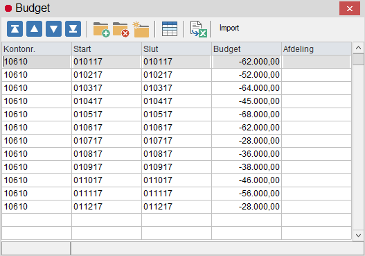 For hver konto, man ønsker at indtaste budgettal for, indtastes en linie pr. budgetperiode. Længden af perioderne er valgfrit. Ovenfor er valgt at indtaste tallene pr. måned. For indtægtskonti, hvor saldoen vil være i kredit, indtastes budgettallet som et negativt tal.