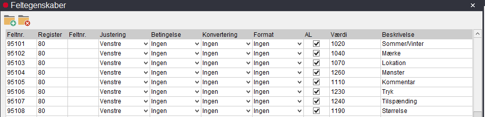 Koderne skal i feltegenskaber for formularen, hvor Register sættes til 80, AL markeres og Værdi sættes til feltets nummer i bilregisteret. Da der oftest er tale om tekster, der skal udskrives, bør Betingelse sættes til Ingen.