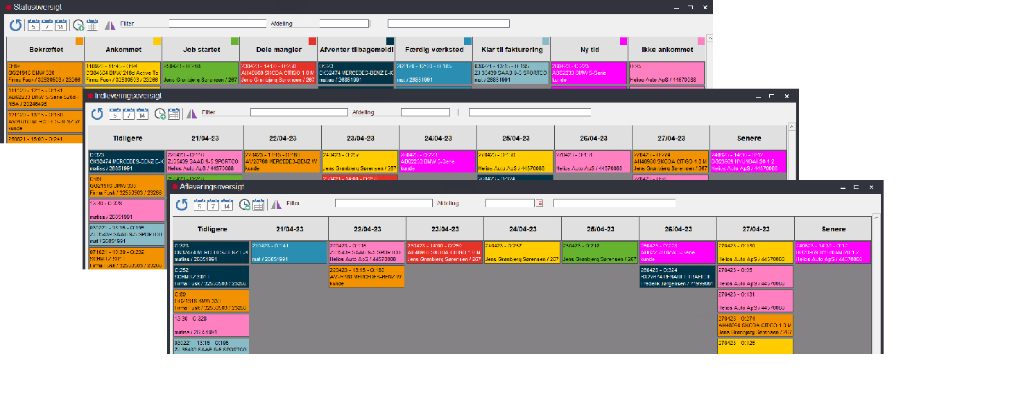 Statusoversigten fungerer tæt sammen med både salgsordren og planlægningskalenderen. Fra salgsordren trækkes oplysninger om ind- og aflveringstidspunkter og fra kalenderen trækkes oplysninger om ordrens status.