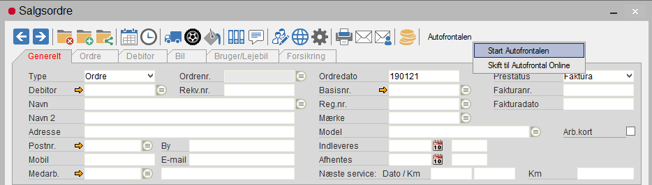 Hvis man klikker på knappen på en tom ordre, får man mulighed for at åbne Autofrontalen. Som standard vil Autofrontalen Desktop blive åbnet. Som det ses, kan man fra en tom ordre skifte til Autofrontal Online. Har man valgt Autofrontal Online, kan man skifte til Autofrontalen Desktop og man kan vælge at åbne Autofrontalen med åbne opgaver.