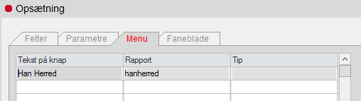 Tilføj en linie under de linier, der eventuelt findes i vinduet i forvejen. I feltet Tekst på knap indtastes den tekst, der skal vises på knappen i salgsordren. I feltet rapport skal der stå hanherred. Feltet Tip er valgfrit. Udfyldes det, vil teksten vises, når musen holdes hen over knappen. Klik på Gem.