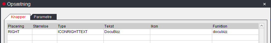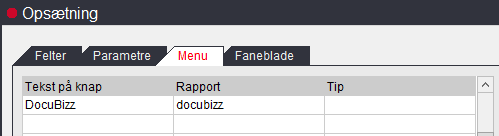 Tilføj en linie under de linier, der eventuelt findes i vinduet i forvejen. I feltet Tekst på knap indtastes den tekst, der skal vises på knappen. I feltet rapport skal der stå docubizz. Feltet Tip er valgfrit. Udfyldes det, vil teksten vises, når musen holdes hen over knappen. Klik på Gem.