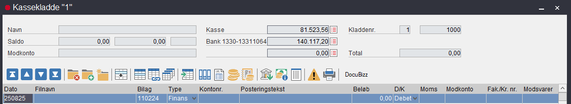 Når man klikker på knappen, der er oprettet i kassekladden, vil Helios® hente konteret bilag fra Docubizz til kassekladden. Filen DocuBizz2ERP.csv skal findes i mappen erp på FTP serveren. Findes filen ikke, må DocuBizz kontaktes.