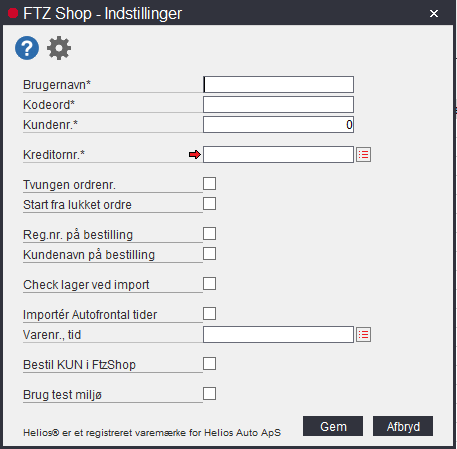 Brugernavn, kodeord og kundenr. leveres af FTZ. Disse skal indtastes for den enkelte Helios® bruger.
